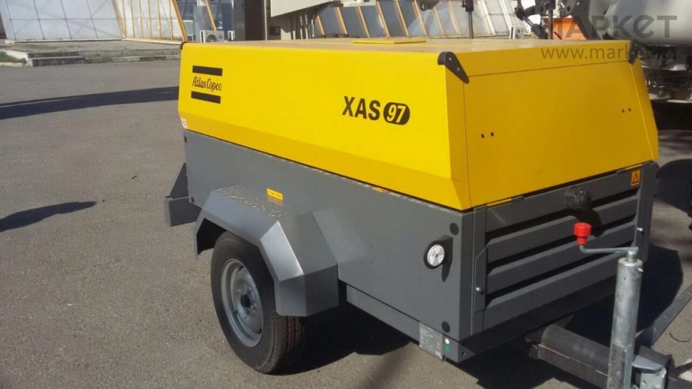 Дизельный компрессор XAS 97 имеет одноступенчатый винтовой маслозаполненный элемент производства Atlas Copco Airtec приводимый в движение через гибкую резиновую неразъемную муфту от дизельного двигателя марки Deutz. Установка смонтирована на прочном основании и закрыта прочным всепогодным и шумопоглощающим кожухом. Кожух открывается высоко вверх для доступа к обслуживаемым агрегатам и узлам установки. Кожух и основание оцинковано и окрашено порошковым способом с высушиванием при температуре +200°С. Сжатый воздух поступает к потребителю через три 3/4" выходных патрубка. Оборудован топливным баком емкостью 80 литров.