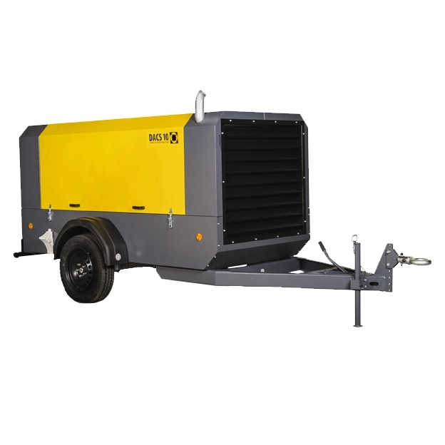 Передвижной винтовой компрессор DACS 10 с дизельным приводом предназначен для проведения работ по абразивоструйной очистке и торкретных работ. Оборудованы выходом сжатого воздуха 1 1/4" для подключения пескоструйного аппарата. Поставляется в двух вариантах исполнения шасси: на двухколёсном шасси с дышлом со сцепным кольцом и на стационарных опорах.