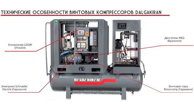 Винтовые компрессоры Dalgakiran состоят из комплектующих от главных мировых производителей: в компрессоре используют винтовую пару от компании Rotorcomp (Италия), двигатель устанавливают от компании WEG, система управления – контроллер LOGIK от компании LogikaControl (Италия), вся «электрика» от компании Schneider Electric (Германия). Всё это гарантирует высокую надёжность компрессоров Dalgakiran.