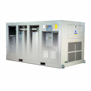 - Корпус оборудован шумоизоляцией и легко открываемыми люками для удобного доступа к компонентам системы. Компрессор обеспечивает низкий уровень шума во время работы и оснащен датчиками давления и температуры на выходе из винтового блока.
