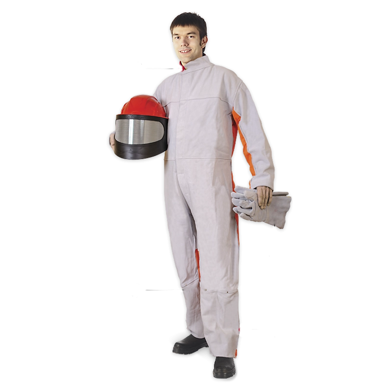 Стандартный костюм абразивоструйщика и кожаные перчатки защищают оператора от пыли и от рикошета абразива. Прочная хлопковая ткань на спине позволяет воздуху циркулировать, а вставки из толстой, специально обработанной кожи надёжно защищают оператора от пыли и рикошета абразива. Костюм оснащен двойной застёжкой "молния", застежками на брючинах для защиты от попадания пыли и абразива под одежду. Костюм прошит двойным швом для обеспечения долговечности эксплуатации.
