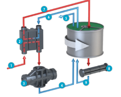 Полный поток горячего сжатого воздуха поступает из компрессора и проходит через теплообменник MDG (2) и охладитель с водяным охлаждением (3). Охлажденный сжатый