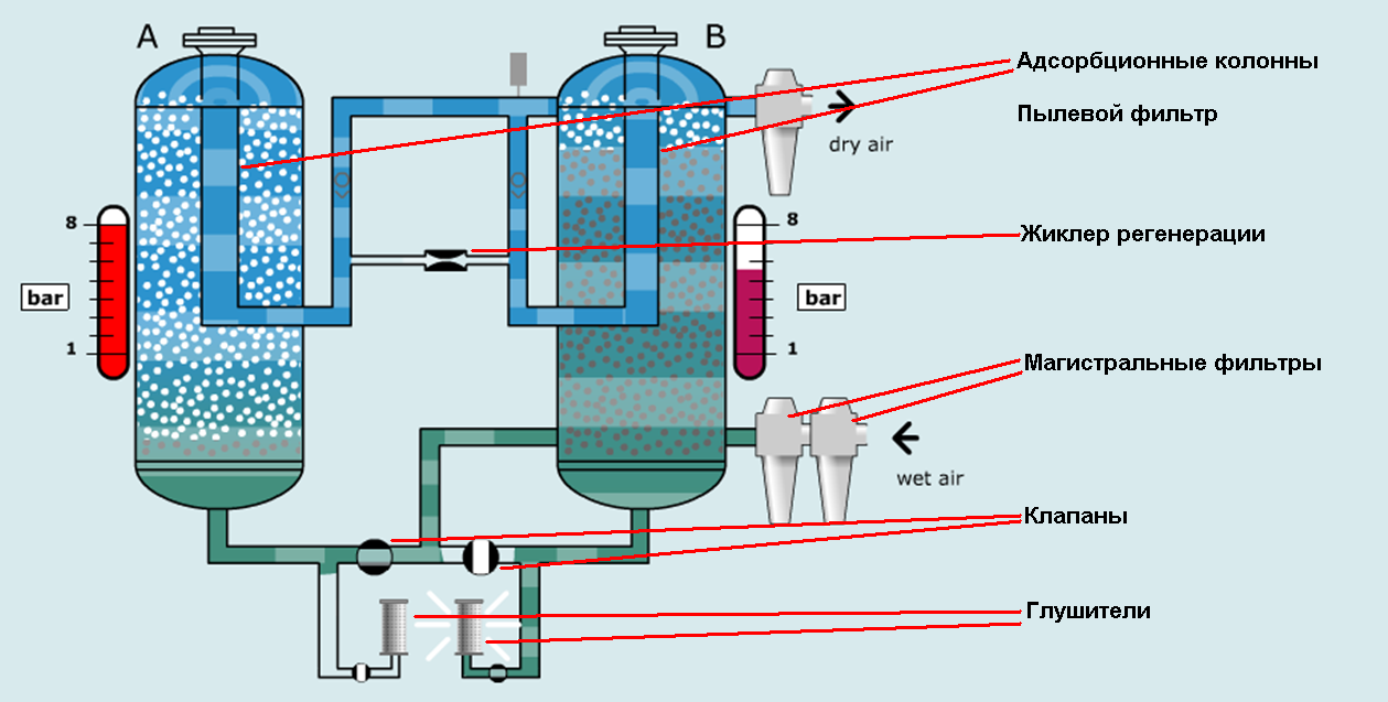 Принцип работы данного вида установок довольно прост. Влага пропускается через адсорбент (молекулярное сито) который ее поглощает. В качестве влагопоглотителя чаще всего использует: алюмогель, двуокись кремния, силикагель и другие. При работе агрегата адсорбент в нем проходит регенерацию. В следствии этого частицы масла, воды или даже газов (метан, оксид углерода, углекислый газ) выводятся из молекулярного сита с помощью продувки или нагрева.